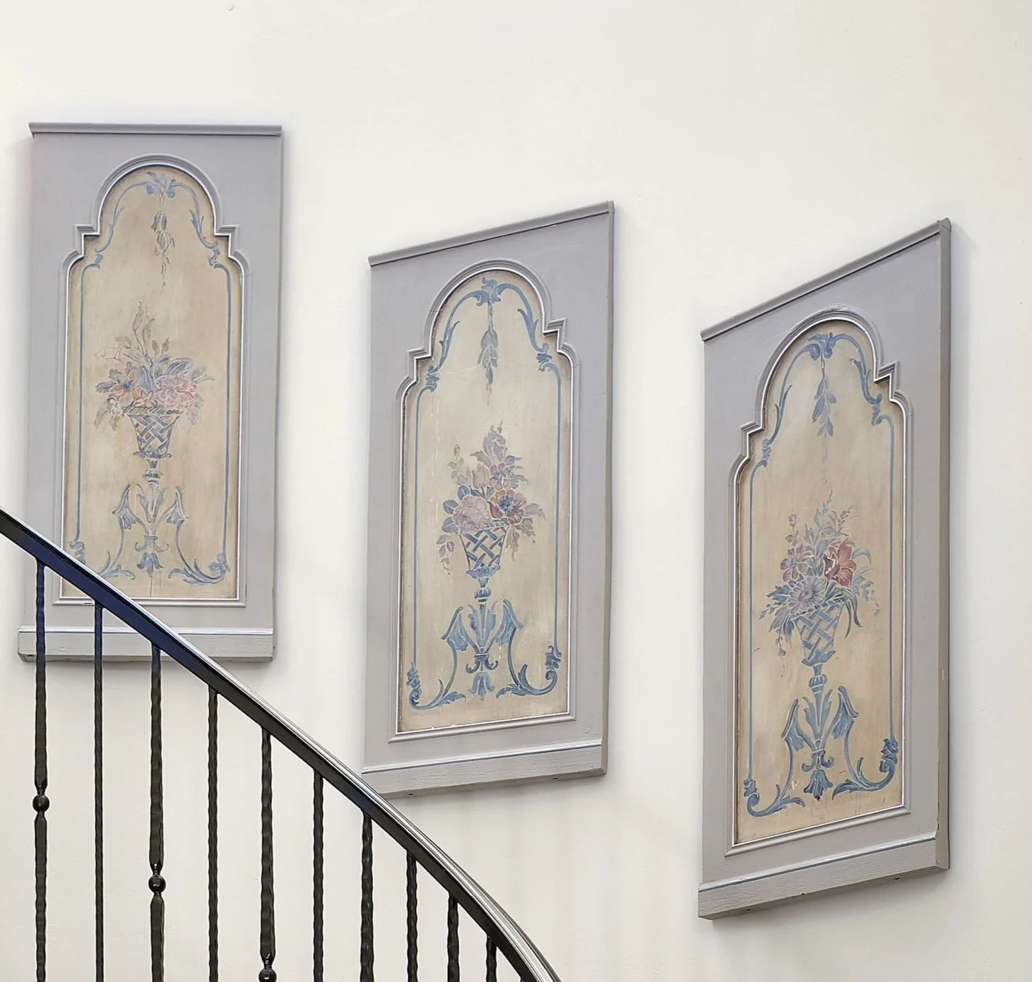 This is a curved, cylindrical staircase. We had to know the amount of curve so that the art which adorns the wall could fit relatively flush to the wall. You can’t do wide art on a curved wall without it looking like it’s about to fall off, not to mention there’s no central format for hanging it. So the three pieces had to be tall and narrow in proportion to the space we had on the wall and also needed to fit in relationship to the other elements thereon.