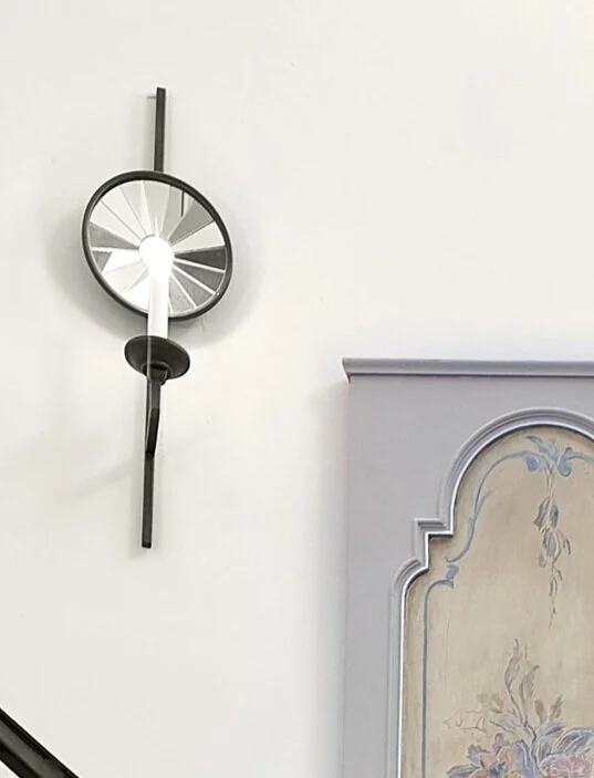 There’s a light and window on this wall. They take up visual space, so the everything hanging needs to find a relationship to what’s built-in there. The wall sconce needed to be high enough so as not to hit your head, but low enough to not interfere with the window. We selected something simple that shines outward to fill the area rather than directly down on the steps (which would require more of them to light the way, reducing the clean aesthetic we wanted to achieve).