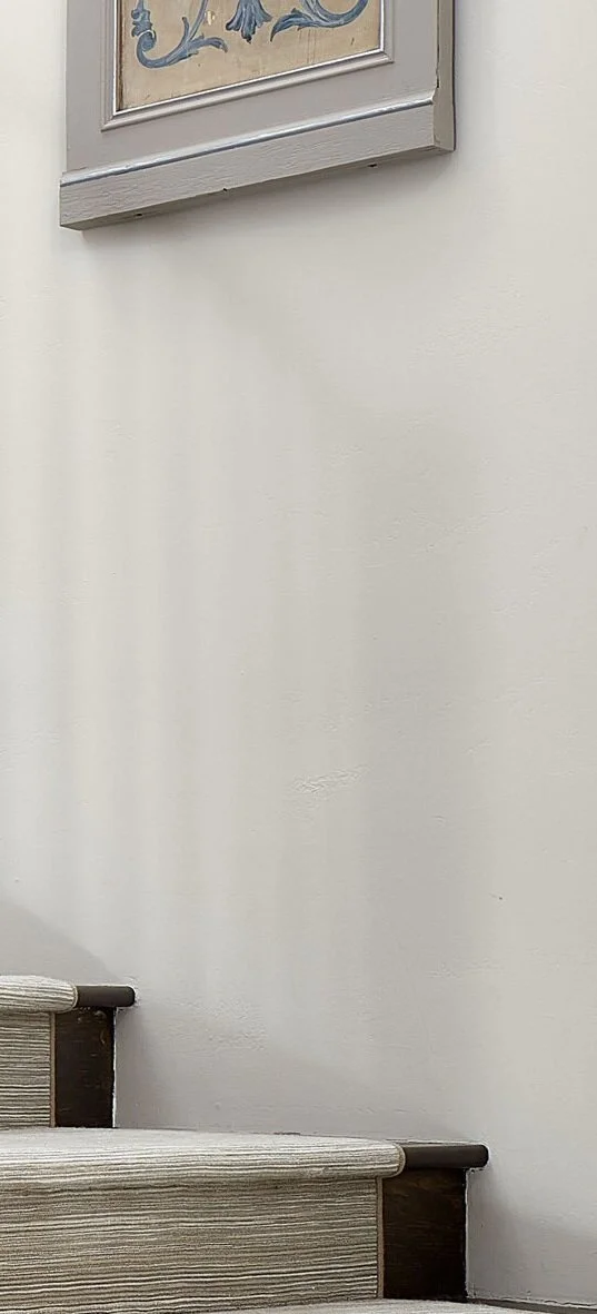 Color connection. The stair coverings and the art on the wall have those soft ivory tones to them. It shows up in places on the table-top urn as well. Your eye isn’t caught off-guard or mis-directed, everything folds gently in with the soft wall-color. What stands out here, then, as a result is the shape of the stairs! They are adorned, not overcrowded, but stand out as a unique architectural feature. Everything feels at home here.